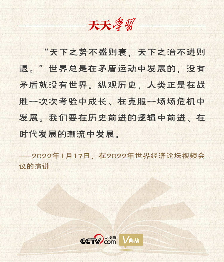 天天学习1月17日,习近平主席在北京出席2022年世界经济论坛视频会议并发表题为《坚定信心 勇毅前行 共创后疫情时代美好世界》的演讲,阐释中国理念和主张。习主席指出,当今世界正在经历百年未有之大变局。这场变局不限于一时一事、一国一域,而是深刻而宏阔的时代之变。时代之变和世纪疫情相互叠加,世界进入新的动荡变革期。