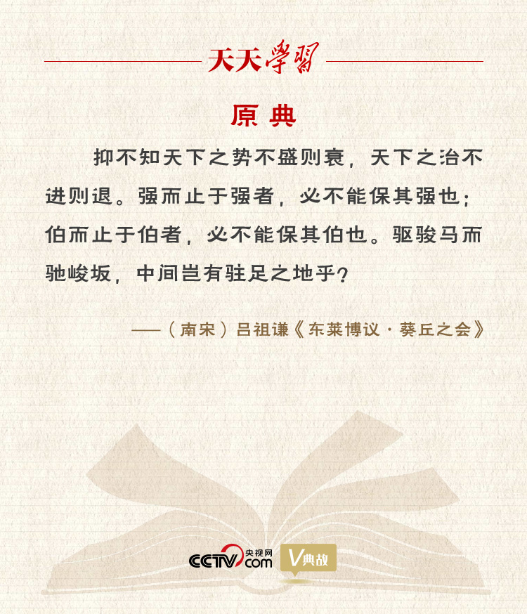 “天下之势不盛则衰,天下之治不进则退”出自《东莱博议》卷十一《葵丘之会》,是吕祖谦就齐桓公葵丘会盟发的一篇议论,意思是:天下大势此消彼长,如果不能继续强盛就会走向衰落;国家治理不进则退,如果不能继续前进就会走向倒退。事实也正是如此。通过葵丘会盟,齐桓公成为春秋时期的首位霸主,登上霸业的顶峰。葵丘会盟后,齐桓公志得意满,特别是在管仲去世后,任用易牙、竖刁、开方等一批小人,日益走向昏庸,齐国国势也逐渐衰落。对此,吕祖谦认为,无论诸侯、公伯还是霸主,如果“强而止于强”“伯而止于伯”,那么强者“必不能保其强也”,伯者“必不能保其伯也”。