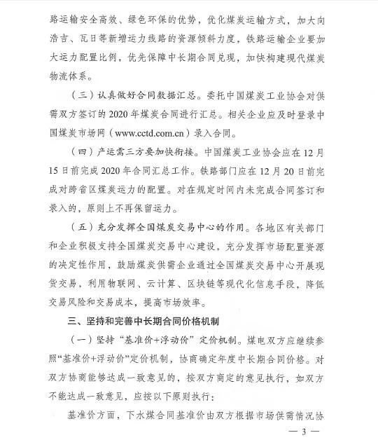 12月2日,国家发改委印发《关于推进2020年煤炭中长期合同签订履行有关工作的通知》,指出要切实提高中长期合同签订的数量。通知要求,中央和各省区市及其他规模以上煤炭、发电企业集团签订的中长期合同数量,应达到自有资源量或采购量的75%以上,较2019年水平有合理增加,鼓励引导新投产煤矿签订更高比例的中长期合同。