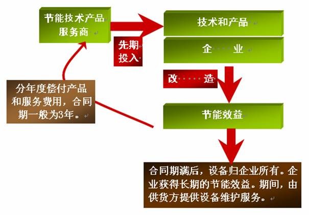 企业按照合同能源管理模式运作节能项目,由节能服务商预先向企业提供节能项目设计、原材料和设备采购、施工、监测、培训、运行管理等一条龙服务。在节能改造之后,企业可利用节约的能源费用来支付节能技术改造的成本。合同期后,企业将享有全部的节能效益。