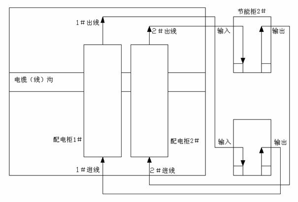 2台3相132kVA的节能设备接线,需要从变电所配电柜引出电缆(线)到配电房外面固定,然后再引回电缆(线)到原配电柜,再输出到高杆灯上(每台7根)。安装简略图如图4所示。