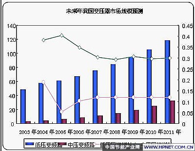 我国变频器总的潜在市场应为1200~1800亿元,其中常压变频器约占市场份额的60%左右,中、高压变频器需求数量相对比较少,但由于单台变频器功率大、售价高,应占市场的40%左右。