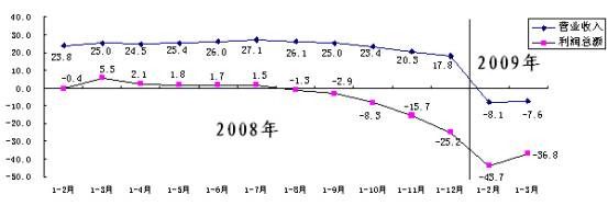 1:2008年至2009年3月营业收入、利润增长变化趋势(单位:%)