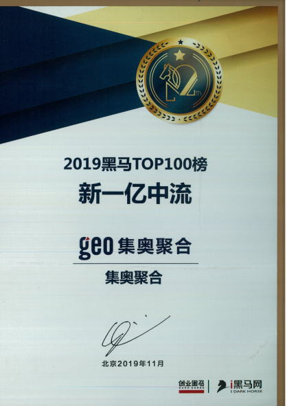 黑马TOP100榜:新一亿中流 集奥聚合荣誉证书