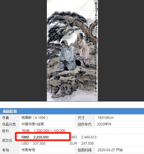 从以上作品都在百万元上下的成交记录来看,杨国新先生的人物绘画作品,不论文人、仕女或是禅道题材,市场地位可见一斑!与已故知名大家作品相比,价格方面升值潜力还是极大的!此时如果以合适的最优价格收藏到如此优秀名家的精品力作,升值增长也只是时间问题。