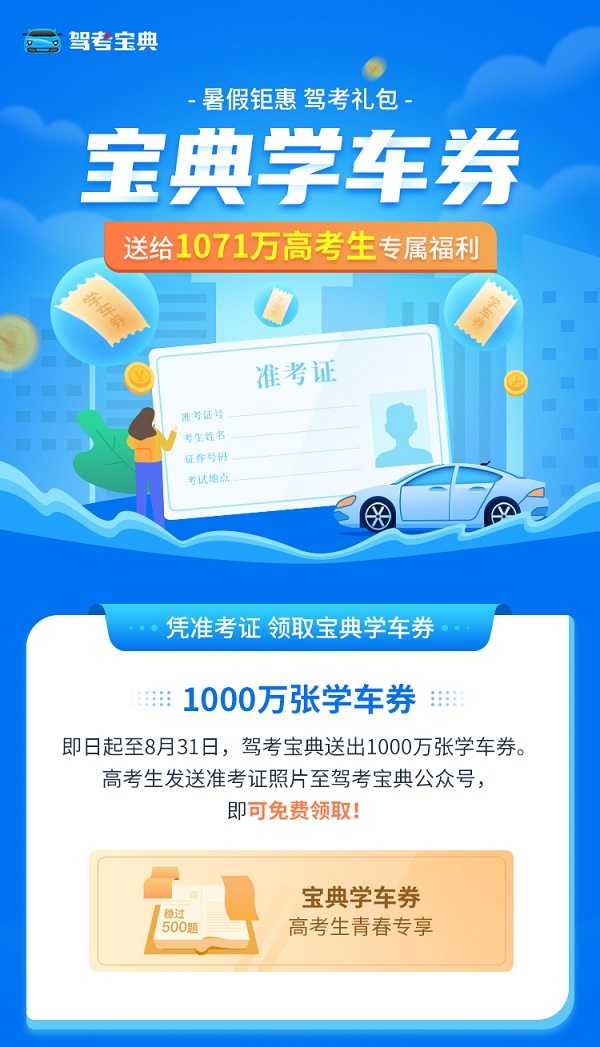 即日起至8月31日,驾考宝典将送出1000多万张学车礼券,凡是参加2020年高考的考生,关注驾考宝典微信公众号发送准考证照片,即可免费领取价值不等的宝典学车券,尽享驾考宝典VIP会员权益。