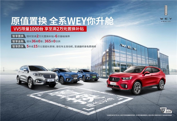这位“朋友”可是经过我层层挑选后的最满意车型,要问我为何这么说?这还得从VV5加入“原值置换,全系WEY你升舱”活动说起。只要你是长城品牌(C30),哈弗品牌(H1、H2、H4、H5、F5、M6、H6、F7)、WEY品牌全系车型的车主,前往置换VV5便可享受2万元置换补贴、6次基础保养,根据车龄、车况的不同,最高可实现100%原值置换,而我家中的哈弗H6正好可以参加此活动,以置换的方式换新,十分划算。若你是其他车型的车主,同样也能享受到1万元置换补贴,以及6次基础保养服务。