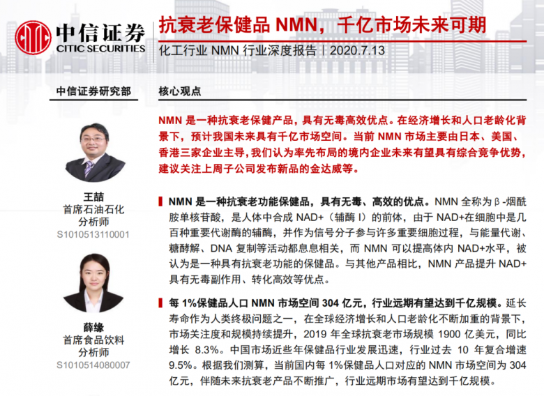 资料显示,NMN又称β-烟酰胺单核苷酸,在能量代谢、DNA修复等生命过程中扮演着重要角色,其早在2013年便被哈佛医学院遗传学教授大卫·辛克莱尔首次发现具有显著的逆转衰老效应。2019年,华盛顿大学今井新一郎教授证实,其使实验动物的平均剩余寿命延长了2.3倍。