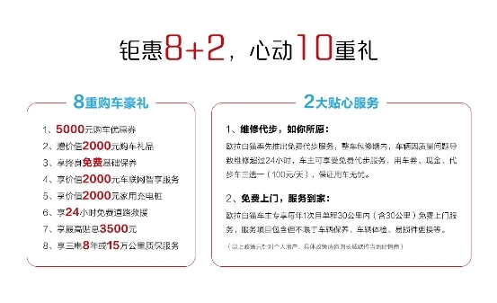 怎么样,经过一番深入的了解,大家是不是已迫不及待地想要把这只大白猫带回家了呢?莫急,现在上天猫长城汽车官方旗舰店购买欧拉白猫,还能享受8重购车豪礼+2大贴心服务。此外用户支付9.9元意向金即可到手5000元购车优惠券,并获赠价值2000元的购车礼品;前300名支付2000元大额定金的用户,还能与意向金权益叠加再享6重豪礼。同时,欧拉白猫车主专享2大贴心服务,包括率先升级的维修补偿服务,以及贴心周到的免费上门服务。