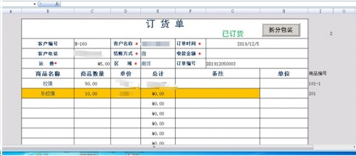 当商品有需要分包装下订单发货 在商品名称明细行会黄色标记出来 只需点击拆分包装后会自动匹配这个产品用到的分包装优先选择分包装的计量单位 【规格】对应