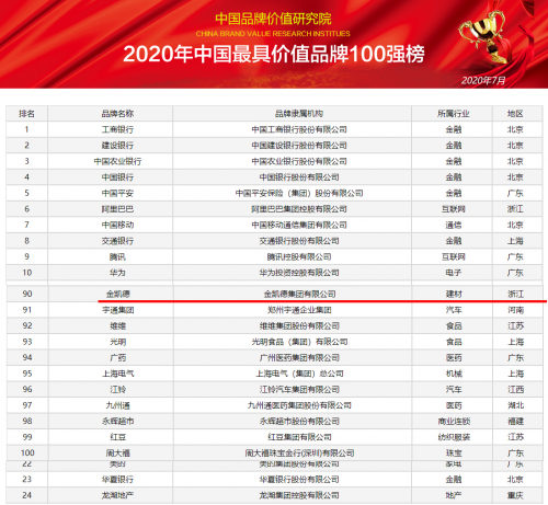 近日,“2020年中国最具价值品牌100强排行榜”发布,这是对我国品牌建设、未来发展潜力及综合市场竞争力进行全面、科学、独立的品牌价值发展调查研究后,具有强大市场影响力的中国品牌价值研究院发布的。100家企业品牌从医药生产、金融IT、食品饮料、纺织服装、建材家居等38个行业3200个重点品牌中脱颖而出,继续引领了中国品牌的发展。而其中,我国门业知名企业金凯德集团有限公司连续多年入围中国最具价值品牌100强,品牌价值71.19亿元人民币,综合实力不断增强,更为品牌价值注入新的内涵,成为了中国品牌的常青树和先行者,为国内因疫情影响而勉力支持的实业企业提供了很有价值的借鉴。