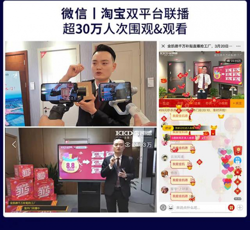 早在创业之初,金凯德便认识到互联网这片销售蓝海的重要性,也是全国唯一入选阿里巴巴“坐标中国”计划的门企。耕耘与收获总是正比呈现,金凯德品牌连续数年在天猫年中大促、双十一、双十二、家装节等活动中表现亮眼,业绩飘红。作为天猫商城的战略合作伙伴,手持大数据技术,将产品升级、重构消费体验、品牌精耕等方面筹划等当,总能推陈出新,挖掘出新的品牌价值潜能。在2020疫情期间这种销售模式更是优势明显,金凯德木门直播将实体零售业需要具备的新思维、新模式、新资源应用到了极致,从而引爆并引领了新一轮的销售热点和市场关注度。