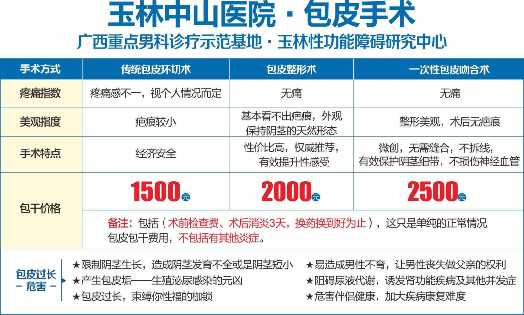 玉林中山医院推出三种包皮手术方式以及相对应的包干价格,来满足不同人群需求: