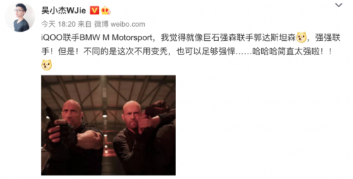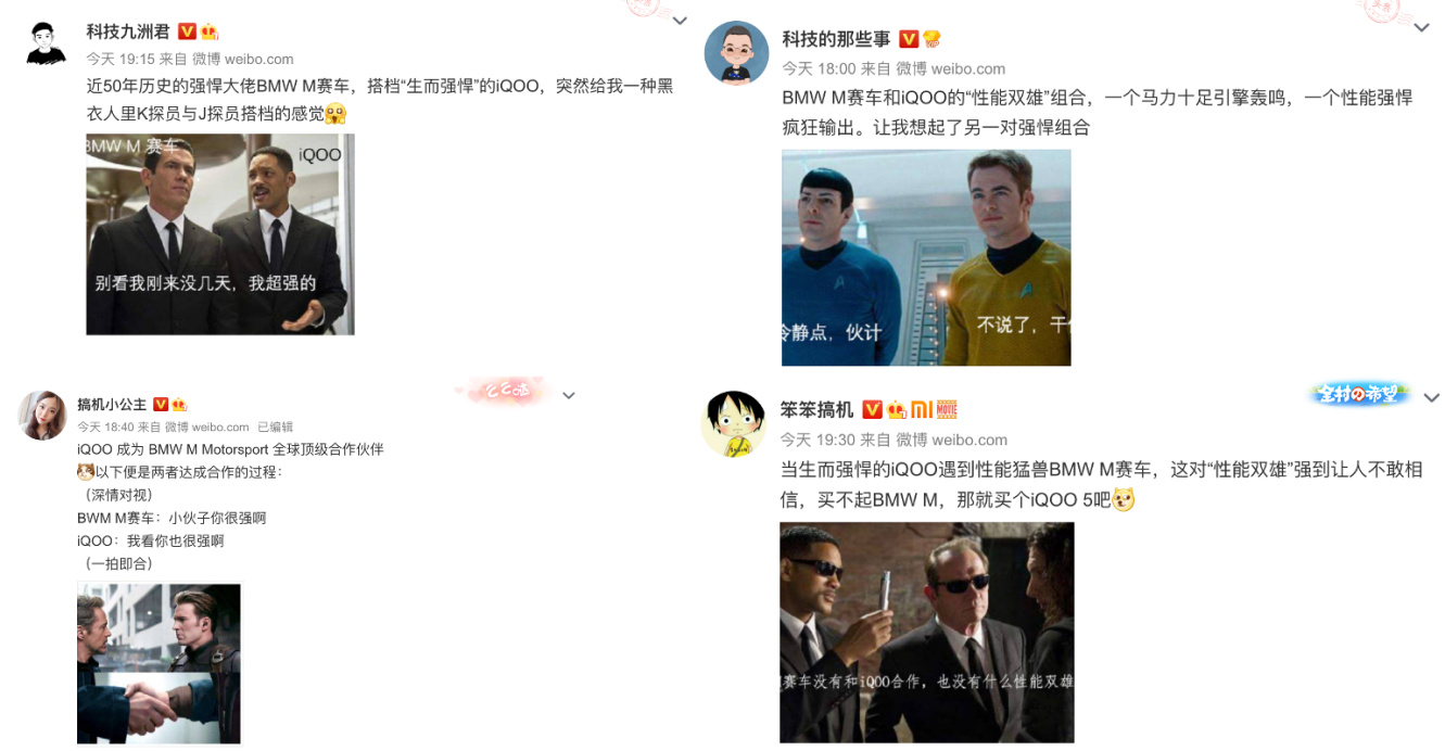 专业赛车对性能有着极致的追求,BMW M Motorsport一直是DTM赛事上当之无愧的传奇;在KPL赛场上,iQOO则凭借强悍性能与专业优化成为官方比赛用机。iQOO 5 系列全新旗舰,有高通骁龙865处理器、UFS3.1超快闪存和LPDDR5组成的性能铁三角,为用户打造全方位的5G旗舰体验和无限的电竞乐趣。众多博主感叹iQOO这次合作,就像两个在各自圈里“强到没朋友”的性能标杆玩家,组了一个“还有谁?”的“性能双雄”CP,不由地想到《复联》里美队和钢铁侠的强强联手、《金蝉脱壳》里史泰龙和州长施瓦辛格的强悍组合,《星际迷航》里的联手打败无数强敌的柯克船长和科学官史波克、《黑衣人》里大战外星人的K探员和J探员。