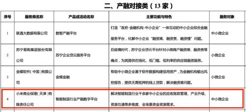 此次《推荐名录》中,共征集筛选包括稳就业促就业、产融对接、供应链对接、数字化运营等8大类、105家服务商的117项服务产品及活动。入选项目在激发市场活力和企业创造力,以新动能支撑保就业、保市场主体方面均表现出色。小米金融产融数字平台的入选,则是国家层面对小米金融在助力做好“六稳”工作、落实“六保”任务,激发市场活力和企业创造力的重要肯定。