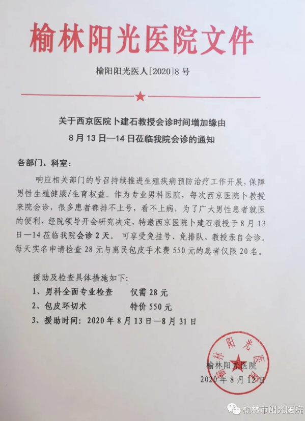 为使病患获得更优质、便捷、实惠的医疗技术服务,榆林阳光医院特邀第四军医大学西京医院卜建石教授(8月14日)周五前来指导交流,让男性患者朋友在家门口就能看专家门诊,享受到温馨的诊疗服务,解决患者“看专家难”问题。前15名预约的男性朋友,还能减免专家挂号费。