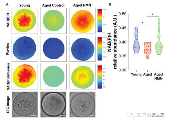 该研究发现,与年轻小鼠(4到5周龄)相比,老年小鼠(12个月龄)的卵母细胞中NADH和NADPH的水平更低,而通过给老龄小鼠补充NMN可以改善NADH和NADPH下降,使其恢复到年轻时的水平。虽然表面上是NADH和NADPH的水平随着补充NMN而恢复,不过作者提到生育力的恢复其实是NAD+水平提高的作用效果,这也说明提升的NADH和NADPH最终是转化为NAD+而达到的抗衰老、恢复生育能力的目的。