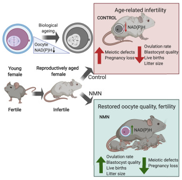 2020年2月新南威尔士大学医学院Lindsay E. Wu的研究组发表于Cell子刊的研究发现,NADH和NADPH在卵母细胞中的水平随着年龄的增长而下降,导致小鼠的卵母细胞功能失调,生育力下降。并证明对处于繁殖期而不孕的雌鼠补充NMN后可提升卵母细胞的NADH和NADPH水平,从而恢复卵母细胞质量,提高排卵率和生育能力。