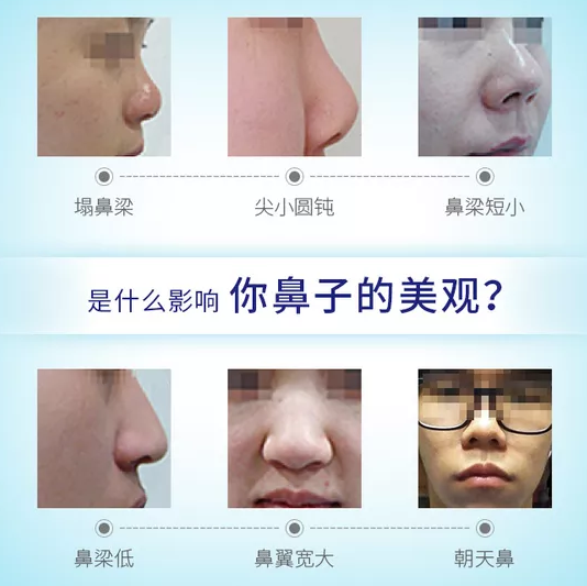 假体隆鼻根据材料不同分为膨体隆鼻、硅胶假体隆鼻;自体软骨隆鼻则是将自体的软骨组织移植到鼻部以垫高外鼻,供区软骨常取自耳软骨、鼻中隔软骨或者肋软骨;注射多见的是玻尿酸隆鼻。