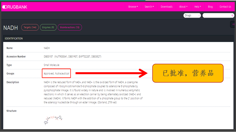在世界最大、最完整的药物和药物靶标资料库Drugbank数据库中,NADH也已经被合法认证,在加拿大政府官方网站上可以查到。这更加说明加拿大的认证是经得起推敲的。