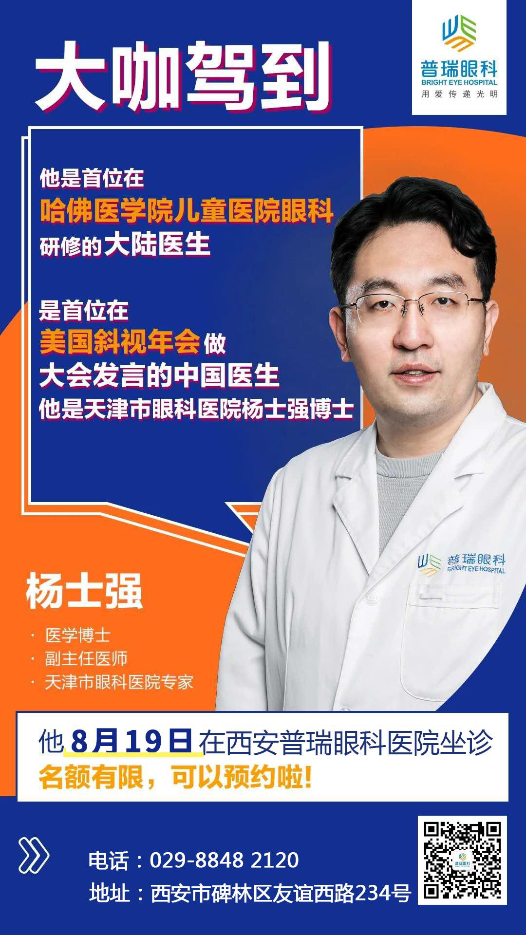 斜弱视福利!天津市眼科医院杨士强博士8月19日坐诊西安普瑞眼科医院