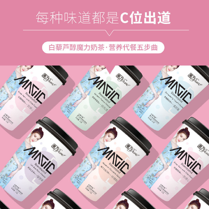 魔力Show白藜芦醇魔力奶茶每杯含有59种营养成分,丰富的优质蛋白、多种维生素、矿物质及膳食纤维,可以全面补充营养,但热量却仅有90大卡,饱腹时间更是长达5小时,每餐可以减少的热量摄入大约在400-600大卡;作为魔力Show全新推出的产品,整个研发过程都经历了全方位的升级,生产部门更是受到了前所未有的挑战,10万GMP认证与HACCP认证车间,配合国际一流生产设备,不管是原料的采购还是产品的包装,每一个环节魔力Show都严格要求,确保高质量的产品送到每一个消费者手中。