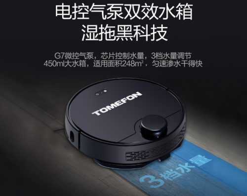 强大的清洁实力还有另一方面的表现,那就是斐纳TOMEFON扫地机器人的智慧湿拖实力。它是拥有电控+气泵双效智能水箱的扫地机器人,具备精准智控功能,安全使用不意外渗水,而且它的水箱容量也非常大,供水时间更长,不必频繁加水、换水,让用户很轻松就能获得一尘不染的家居环境。