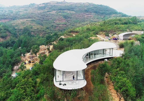 “故乡的云”民宿位于山东省泰安市九女峰片区东北部的东西门村,外形为纯白色的流线型,仿佛一朵巨大的白云漂浮在群山之间。