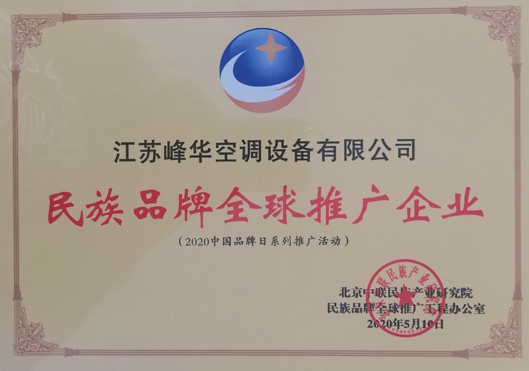 本网讯:2020年9月21日,由民族品牌全球推广工程办公室主办,中国民族品牌(全球)推介平台承办的第三届中国民族品牌全球推介大会在天下第一村华西村召开,共同探讨民族品牌的全球化进程。峰华空调设备有限公司董事长范宝华应邀出席,并获得由北京中联民族产业研究院和民族品牌全球推广工程办公室颁发“民族品牌全球推广企业”荣誉证书。