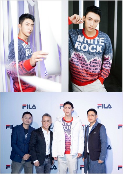 FILA时尚运动代言人黄景瑜现身活动现场,合影从左至右依次FILA大中华区副总裁施睿先生,安踏集团时尚运动品牌群CEO、FILA大中华区总裁姚伟雄先生,FILA时尚运动代言人黄景瑜先生,FILA大中华区副总裁金相淳先生