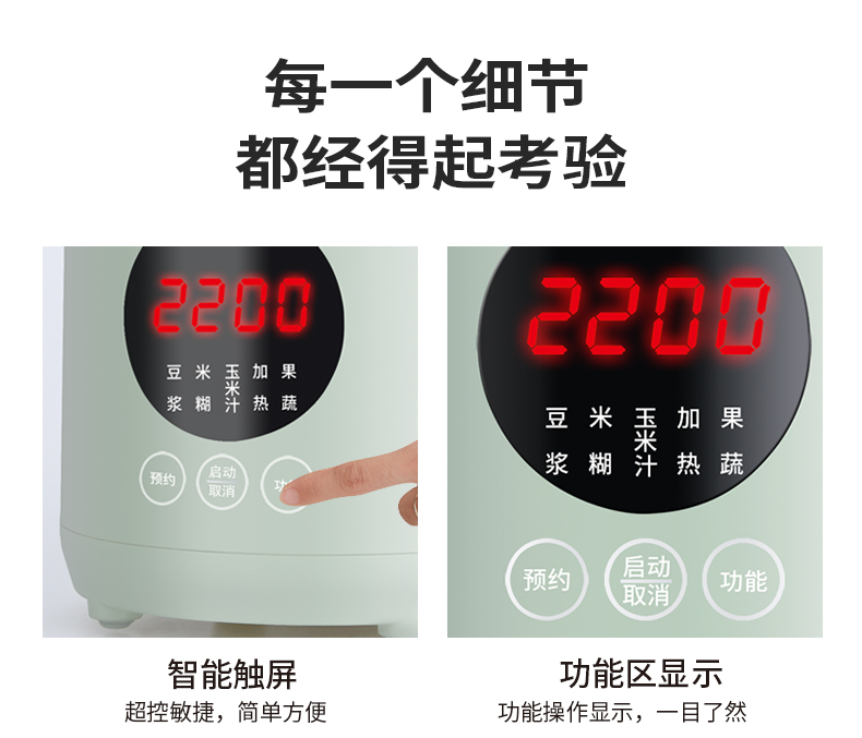 除了功能比较齐全外,在外观设计与选材上也是十分注重的。整体颜色清新亮丽,小巧身材,厨房客厅随处容身。杯体采用高硼硅玻璃杯体,健康且容易清洗。一键自清洗,告别让你头痛的清洗烦恼,给忙碌的生活偷个懒。聚冷聚热不易开裂,安全没有异味,宝宝辅食也能放心使用。内外兼修,用一次就被圈粉,可视化窗口,工作状态清晰可见,绝对是一场视觉与味觉盛宴。