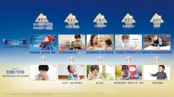 在科学家分享环节,美赞臣大中华区婴幼儿营养研发总监韩军花博士分享了全球知名学术期刊《儿科学杂志》发布的一项历时5年的临床实证研究。这项研究证实,中国婴儿出生后第一年(出生后14天至365天)喂养富含乳脂球膜和乳铁蛋白的婴儿配方奶粉,能够显著提升婴儿的保护力、专注力、认知力、语言力和运动力5大成长力。以保护力为例,临床实证研究结果显示,喂养富含乳铁蛋白和乳脂球膜的配方奶粉宝宝的腹泻发生率与呼吸道感染率较对照组低20%以上。
