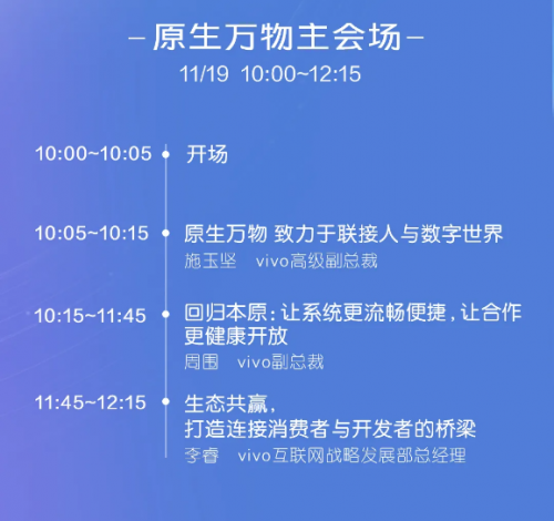 作为一家面向全球科技市场的头部厂商,vivo拥有着规模庞大的用户基础,一直都致力于整合产业创新能力,为用户和合作伙伴提供生态共赢的本原服务。在原生万物主会场,vivo高级副总裁 施玉坚、vivo副总裁周围、vivo互联网战略发展部总经理李睿,将分别就vivo对于原生万物的概念和发展战略进行详细的阐述。