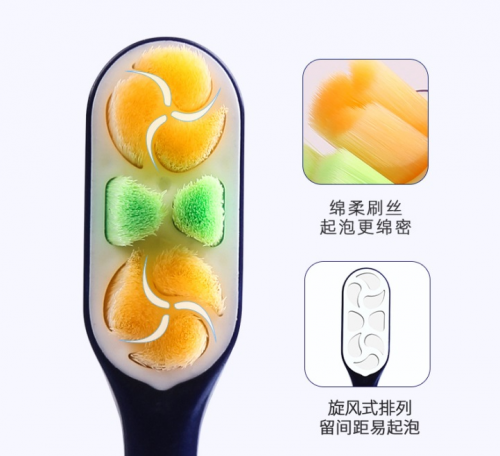 3D双旋风刷头上下各有三股旋风式的清洁刷毛,倍加洁创新地将涡轮概念引入到传统手动牙刷上来,在刷牙的过程中让牙膏泡沫在刷毛和水流的作用力下形成以牙齿为中心的清洁动力,大大提高了牙刷的清洁力。