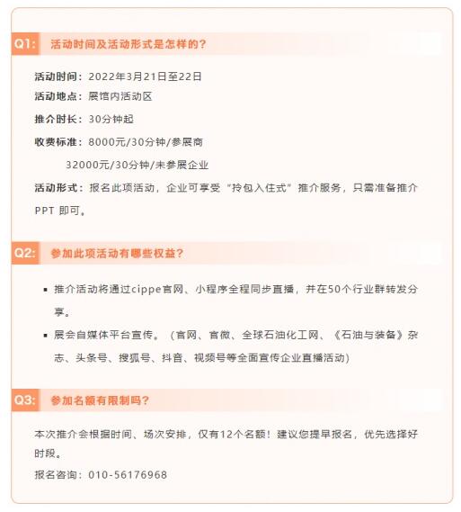 为进一步助力企业发展,推动行业技术交流与进步,cippe2022北京石油展将在展会同期举办“企业新产品新技术发布会”活动。欢迎业内企业报名参与!