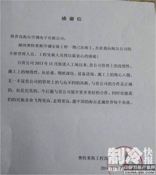 在奥特莱斯的感谢信中,除了表达对海尔管理的肯定,更多的是对海尔中央空调服务的赞许。湖州奥特莱斯由香港亿丰集团投资15亿打造,世界名牌服装等多种产品形态为一体的商业中心,总面积24万平方,这么大的工程项目,既要保证商户正常开业,还要保证安装效果,这对于很多供应商来说难度很大,所以奥特莱斯工程部在选择合作方上格外谨慎。