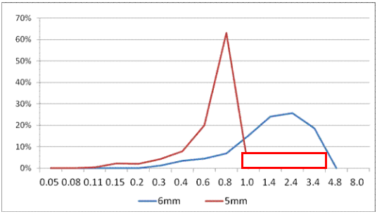 常规锤片式蛋禽料专用粉碎机 的玉米粉碎粒度分布(6mm及5mm)