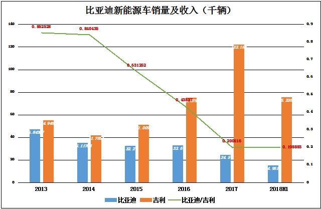 北汽虽已借壳上市,但离开本地政府的“保护伞”难有太大作为,对比亚迪新能源车霸主地位构成威胁的其实是吉利。尽管2017年吉利新能源车销量仅为2.5万辆,不及比亚迪的零头。早在2015年11月,吉利就启动了“蓝色吉利行动”,宣布2020年前能源车销量占比达到90%或以上。实际上2017年、2018年H1,新能源车在吉利销量只的占比分别为2%和1.9%,与“90%或以上”天差地远。