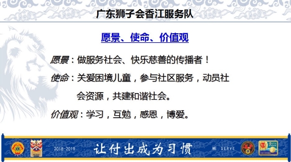 今天我非常荣幸成为香江服务队1819年度队长,我将传承和发扬香江服务队严谨规范的工作风格,继续努力践行我们的初心,在未来的日子里将和香江队30位狮兄狮姐携手完成使命。