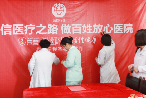 我诚信,我宣言!争做一名合格的同济医护人员,并承诺患者在东营同济医院就医能享受一医一患一诊室全程陪护并尊重保障患者的知情权,隐私权,选择权,监督权东营同济医院作为东营男性健康服务中心,为东营市男性朋友提供了最全面的就医保障,并且以诚信待人,公平公开就医价格的形式,让每一位前来就医的朋友可见到每一项疾病的诊疗价格,克服掉外面医院医生乱收费的情况!每一位医生每一位护士,在接待前来就诊的朋友都是以礼相待!