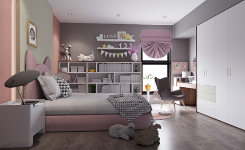关于中隐,柏厨家居除了对常规空间的打造外,更加入了一些对家庭结构方面的人文关怀思考,这种关怀集中表现在对老人房和儿童房的构建之上。小时候我是你的世界,长大后我要给你一个世界,在打造老人房时充分考虑了中老年人的需求,整个卧室环境清雅大气,新中式床头硬包营造出的“悠然见南山”的安逸意境直接给人以视觉冲击。日常使用方面,带格四门移门衣柜给母亲更从容的收纳小世界,而开放格是父亲的收藏小世界,中式的通透格栅则让榻榻米空间变得更加雅致,闲暇时的一杯香茗,闲聊中往昔的美好尽在杯中回味。