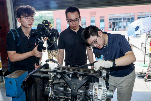 通用技术中国汽研整车测评部主任徐磊(居中)、知乎著名技术类博主钱尧一(右一)现场解构“蓝鲸动力”