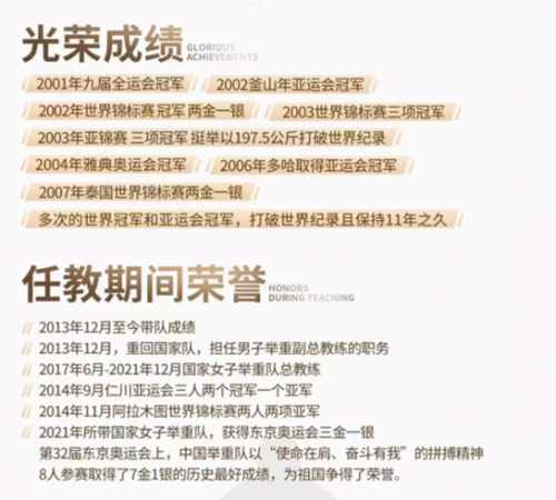 张国政来头可不小,从运动员到教练员,他坚持身体力行,曾多次荣获世界冠军和亚运会冠军,2004年以347.5公斤的总成绩夺得雅典奥运会69公斤级冠军。近年来培养了多名一流的举重运动员,2021年所带国家女子举重队获得东京奥运会三金一银的好成绩,2022年个人更是入选“2021年全国体育事业突出贡献奖”。