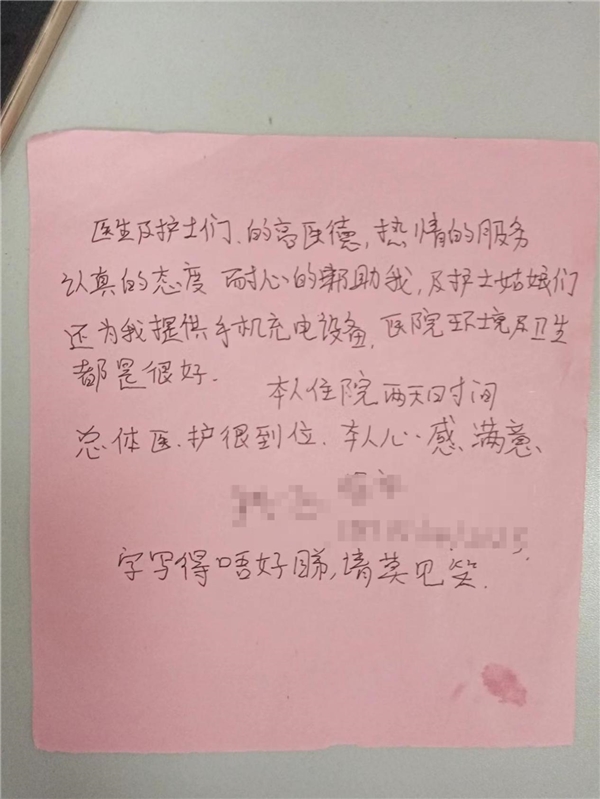 就这样,在医生的指导帮助下,唐某恢复良好,不到一周时间已经基本康复,心里非常感激的唐某这才写下了这封感谢信。