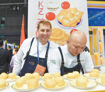 8月17日,在新疆乌鲁木齐举行的2023(中国)亚欧商品贸易博览会上,来自哈萨克斯坦的厨师制作该国美食。