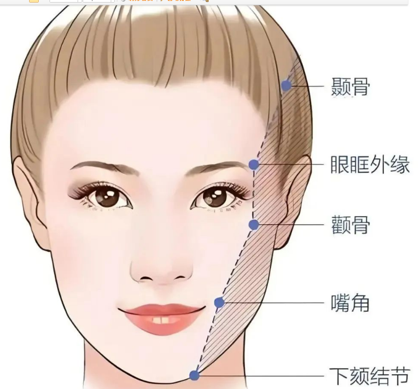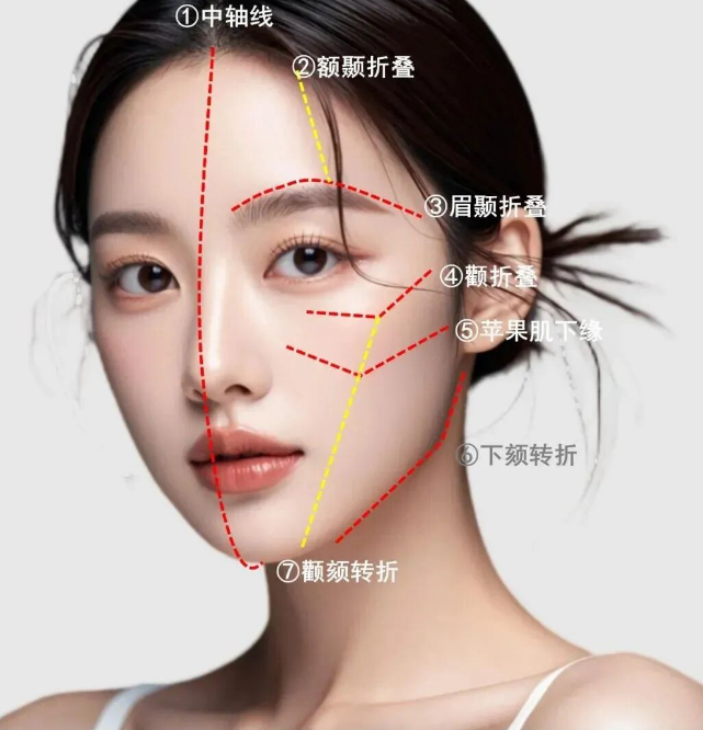 从面部美学的角度上来说,面部折叠度,是以额结节-眉弓-颧弓-口角-下颏5个点的连线为界,将面部分为正面和侧面区域。