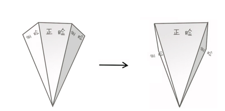 我们可以用正脸与侧脸显示面积的多少来鉴别面部折叠度高低,如下方图片所示:以T区和颧骨为界限,将面部分为三部分,面中部分为正脸区,两侧为侧脸区(折叠区)。