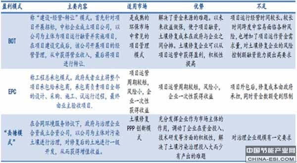 为解决上述问题,我国正积极探索土壤修复行业操作模式,目前已经有EPC模式(工程总承包模式)、BOT模式(建设—运营—转让模式)以及PPP创新模式(公私合作模式)三种,这三类操作模式各有优劣。