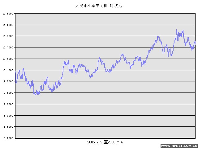 人民币元/1欧元 2005年7月21 至 2008年7月4日