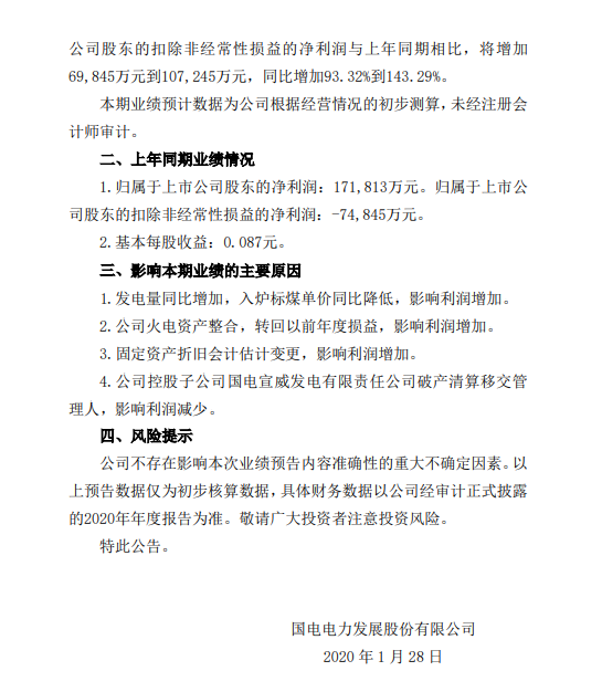 国电电力2020年净利润预计同比增加39.69%到86.25%